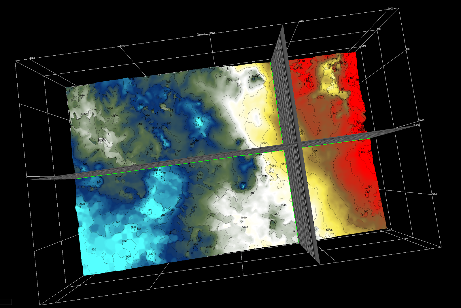 3D Seismic and Well Visualization: Standard way to co-visualize wells (colorful lines) and seismic (grayscale background). The seismic data is 3D, but only two 2D slices through the data are displayed for ease of interpretation by geoscientists.