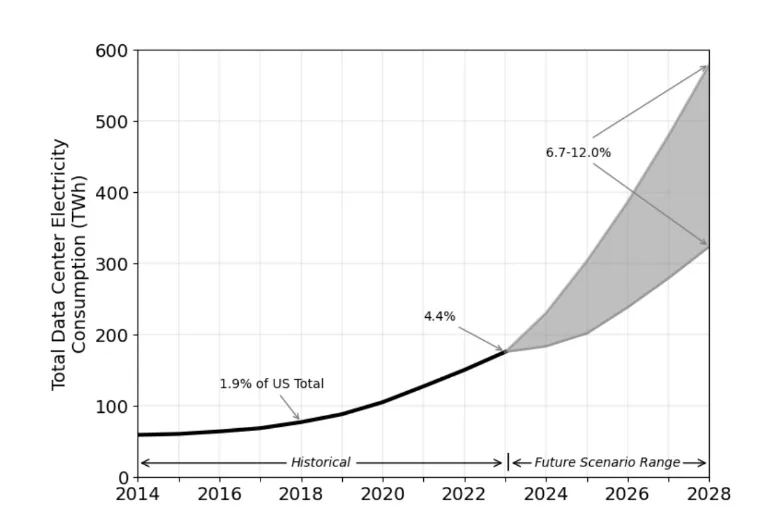 Berkeley Lab’s December 2024 report states that data centers consumed about 4.4% of total U.S. electricity in 2023 and are expected to consume approximately 6.7 to 12% of total U.S. electricity by 2028. The report indicates that total data center electricity usage climbed from 58 TWh in 2014 to 176 TWh in 2023 and estimates an increase between 325 to 580 TWh by 20283.